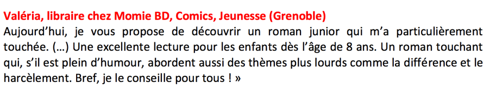 Réseaux sociaux : Des mots pour s’évader / Maman Fouine / Bonheur de maman / Les livres de Cathy / Trois petits tours de page / Orelynoa / Maitresse Katoo lit / Val et ses livres / La cabane des Diplodocus / Bamblinou